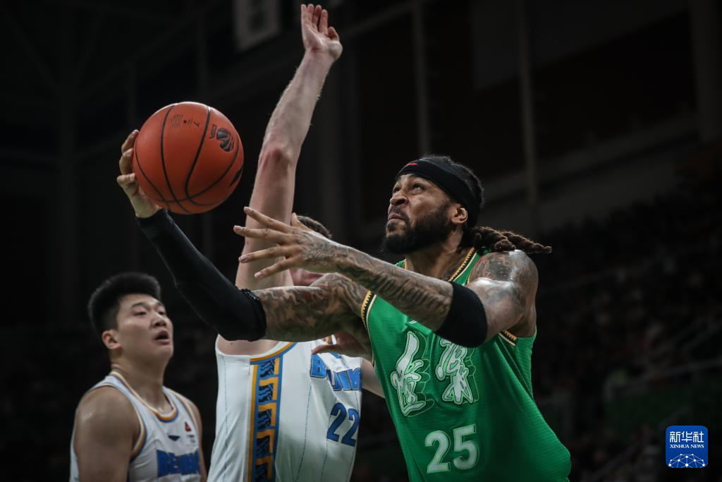 11月12日,辽宁本钢队球员莫兰德(右)在比赛中上篮。新华社记者 潘昱龙 摄