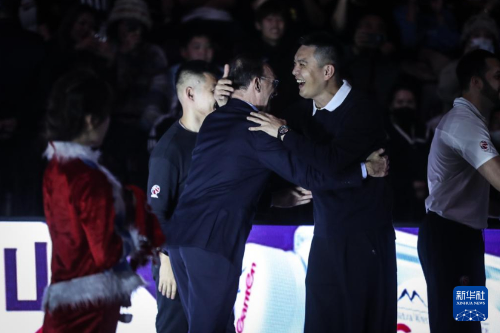 11月15日,在赛前领取冠军戒指仪式中,前辽宁本钢队主教练杨鸣(右二)与现任辽宁本钢队主教练乌戈拥抱。新华社记者 潘昱龙 摄