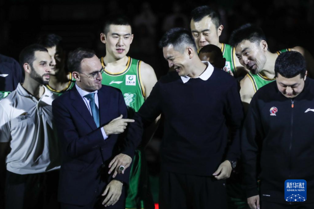 11月15日,在赛前领取冠军戒指仪式中,前辽宁本钢队主教练杨鸣(前右二)与现任辽宁本钢队主教练乌戈(前左二)交流。新华社记者 潘昱龙 摄pagebreak