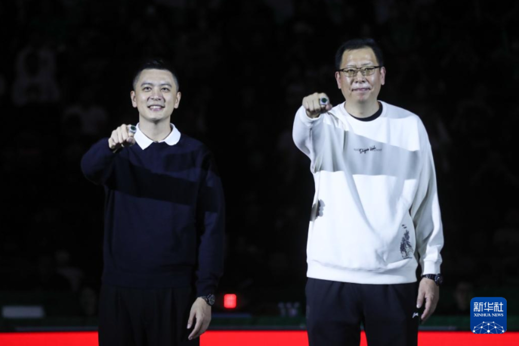 11月15日,前辽宁本钢队主教练杨鸣(左)与前辽宁本钢队助理教练吴乃群在赛前领取冠军戒指。新华社记者 潘昱龙 摄pagebreak