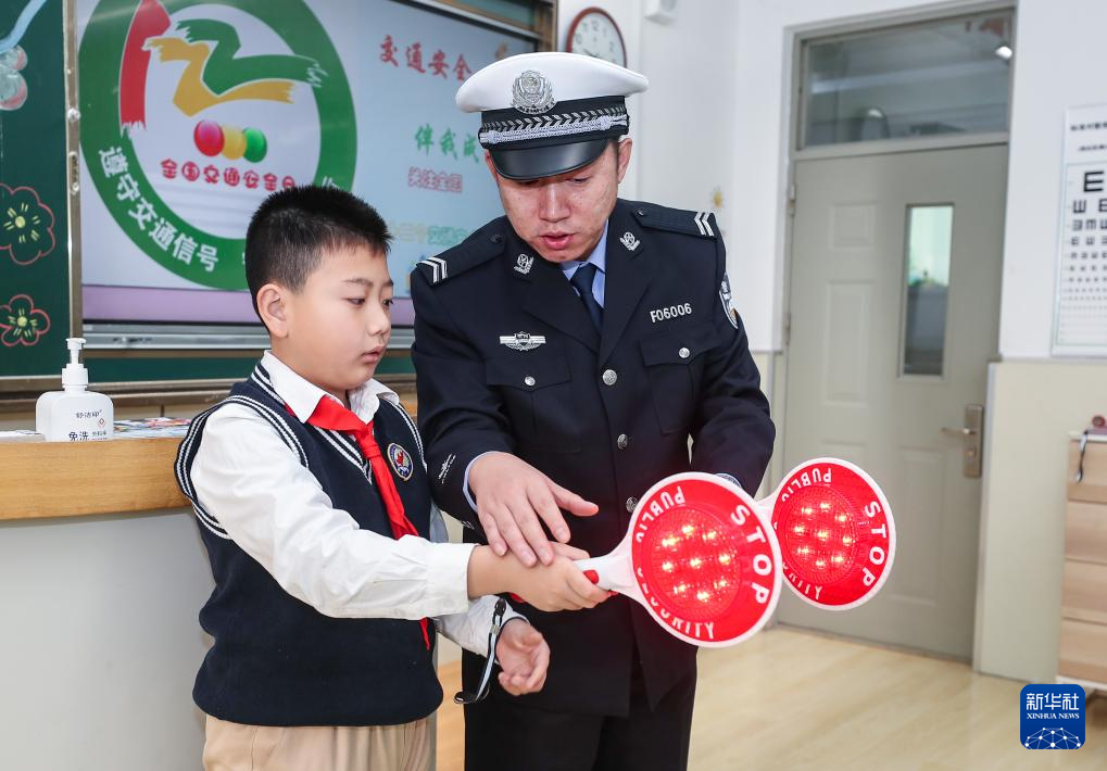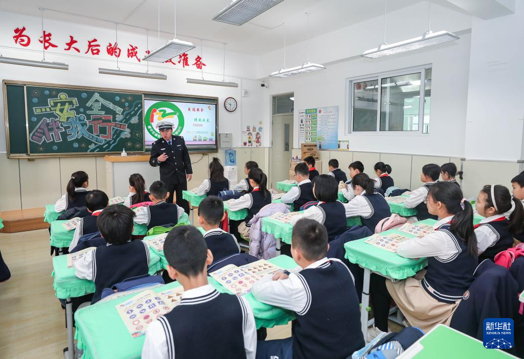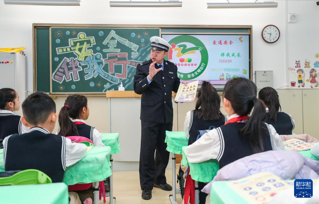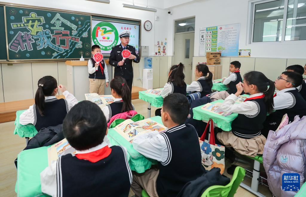 12月1日,沈阳市公安局交通警察局皇姑大队交警万林在沈阳市皇姑区童晖小学为同学们讲解交通安全相关知识。新华社记者 龙雷摄
