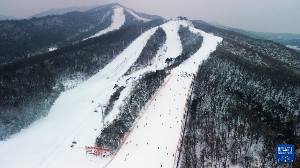 滑雪爱好者在沈阳市东北亚滑雪场滑雪(无人机照片)。新华社记者 陈为 摄