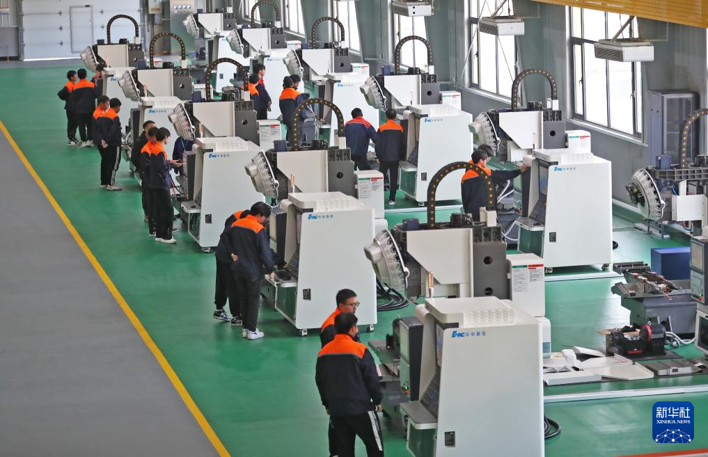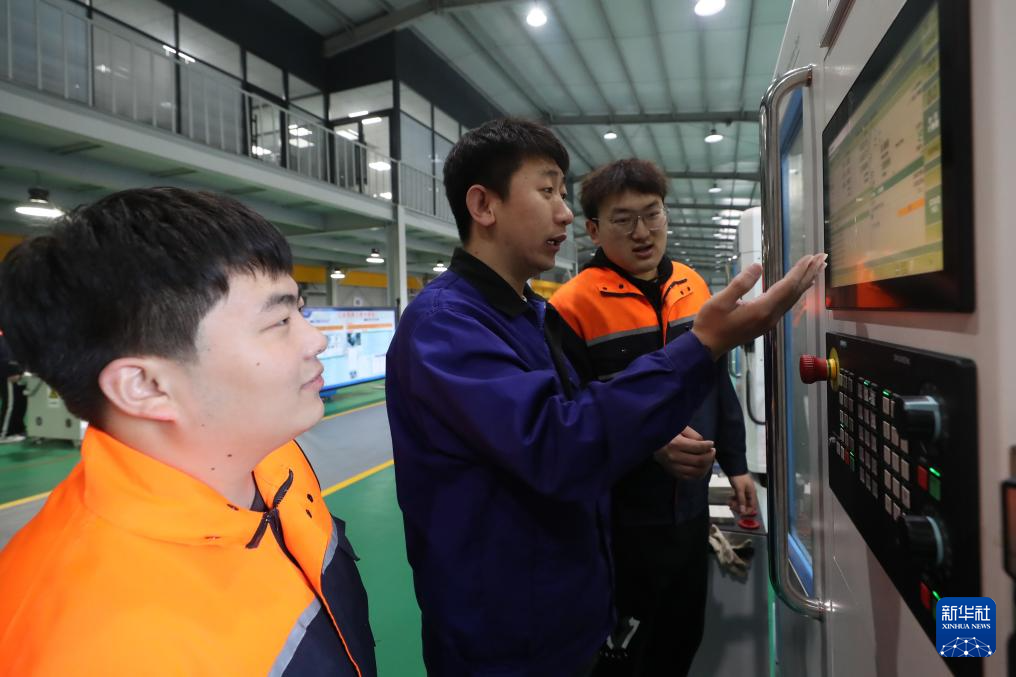 12月6日,沈工-华中数控“一带一路”订单班同学在老师指导下操作数控五轴加工中心。新华社记者 杨青 摄