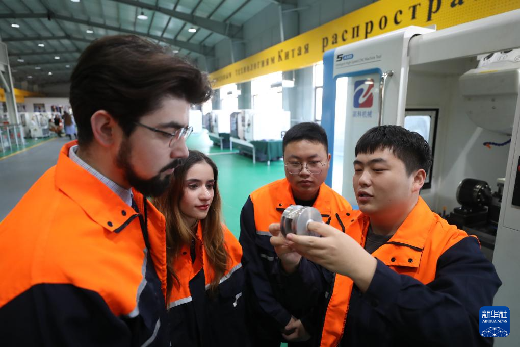 12月6日,沈工-华中数控“一带一路”订单班同学为俄罗斯伊尔库茨克国立大学的留学生讲解数控五轴加工中心操作经验。新华社记者 杨青 摄