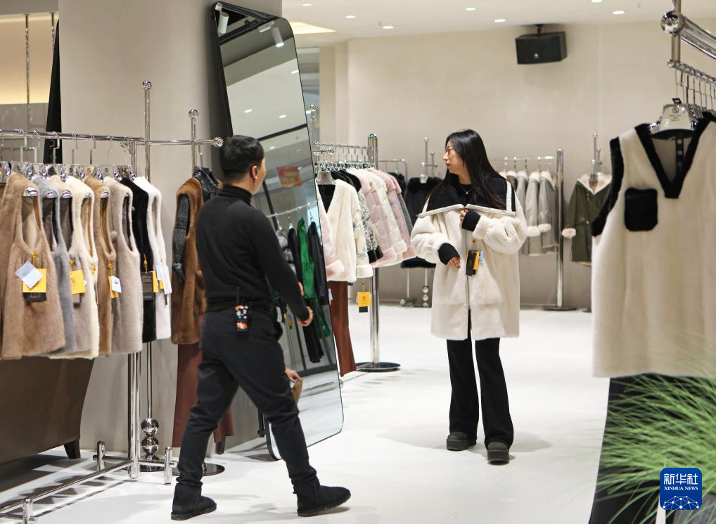 12月20日,在辽宁省辽阳市佟二堡镇的一处商场,顾客在试穿皮草服饰。新华社记者 陈为 摄