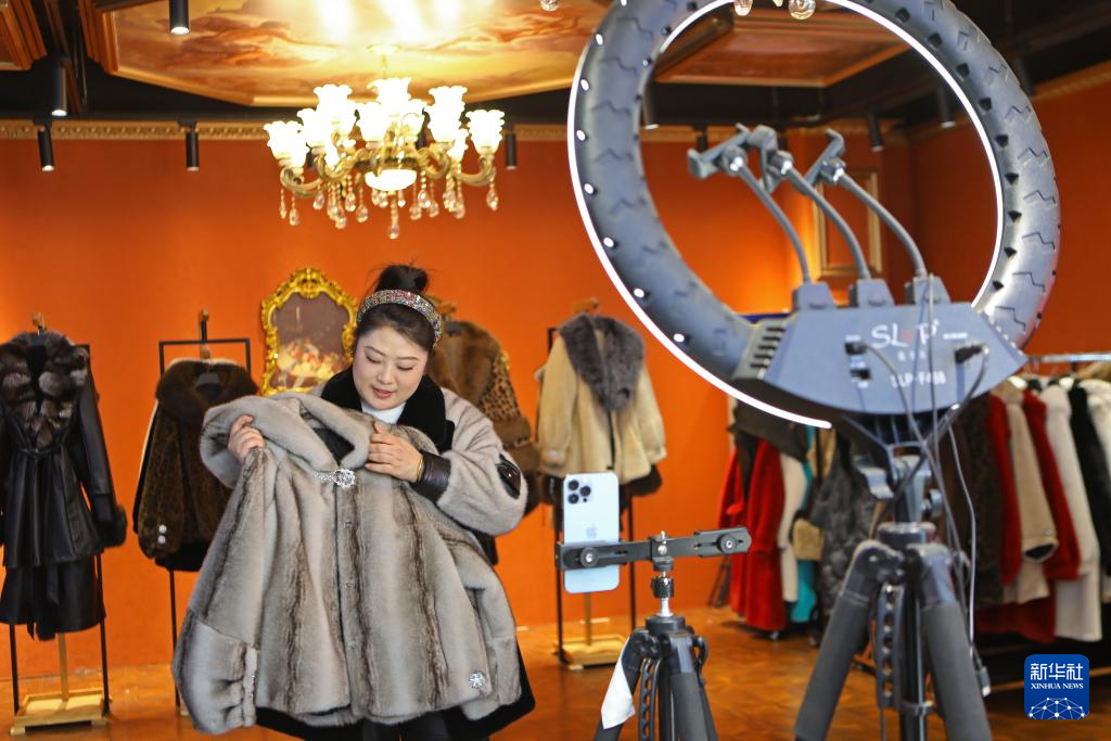 12月20日,在辽宁省辽阳市佟二堡镇,商家通过线上直播平台销售皮草服饰。新华社记者 陈为 摄