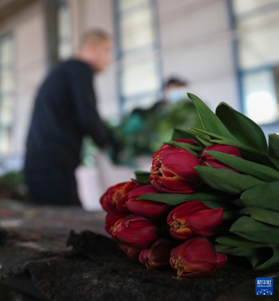 12月28日,工作人员在凌源花卉交易市场打包鲜花。新华社记者 龙雷 摄