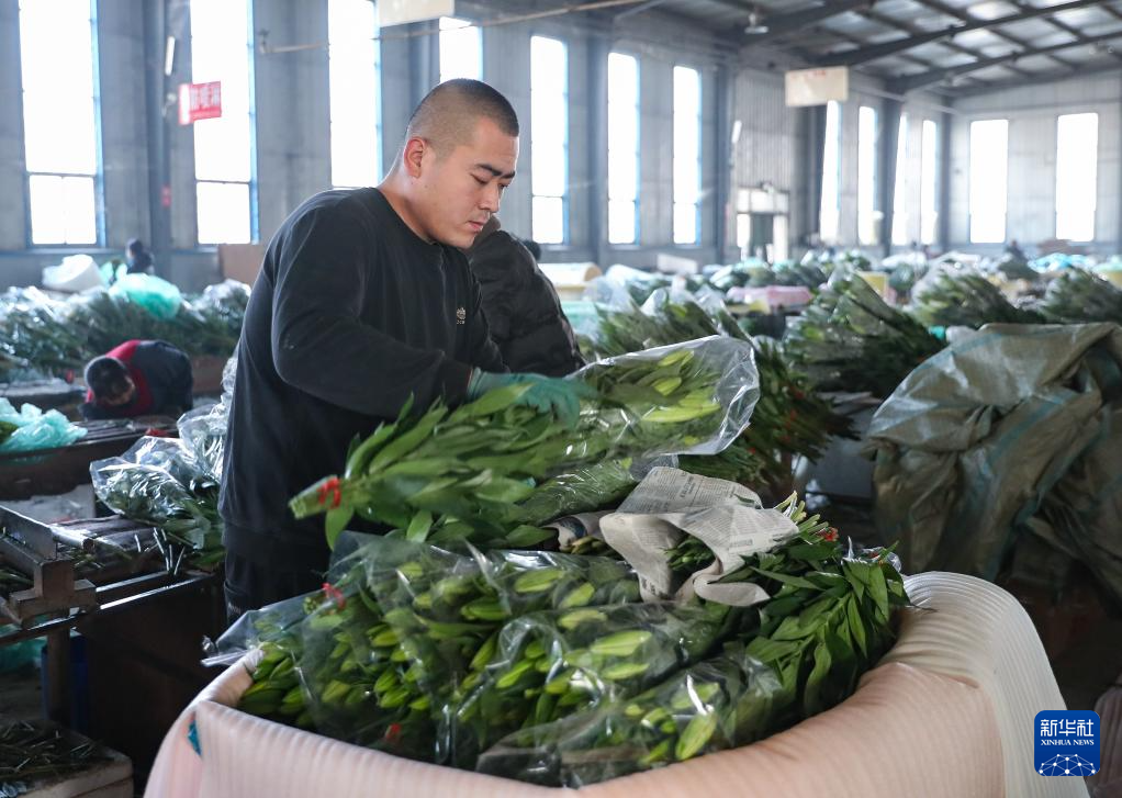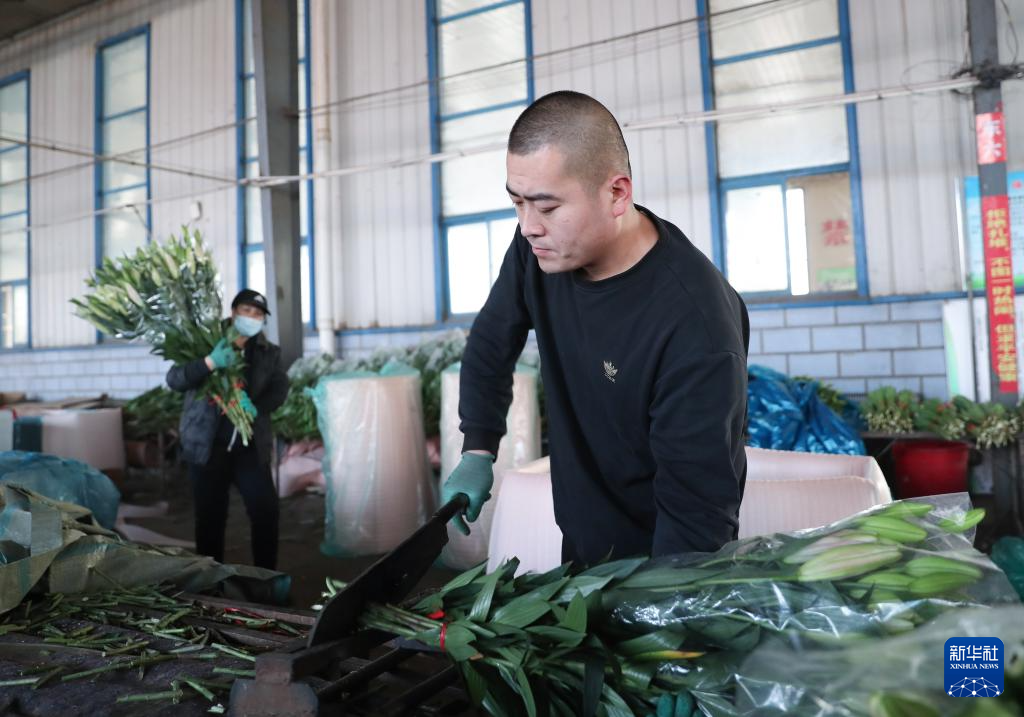 12月28日,工作人员在凌源花卉交易市场打包百合花。新华社记者 龙雷 摄