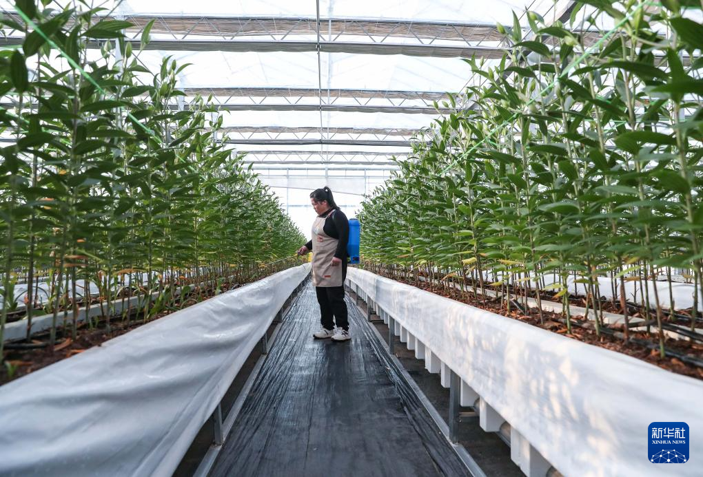 12月28日,工作人员在凌源百合测试中心为百合花喷洒药物。新华社记者 龙雷 摄