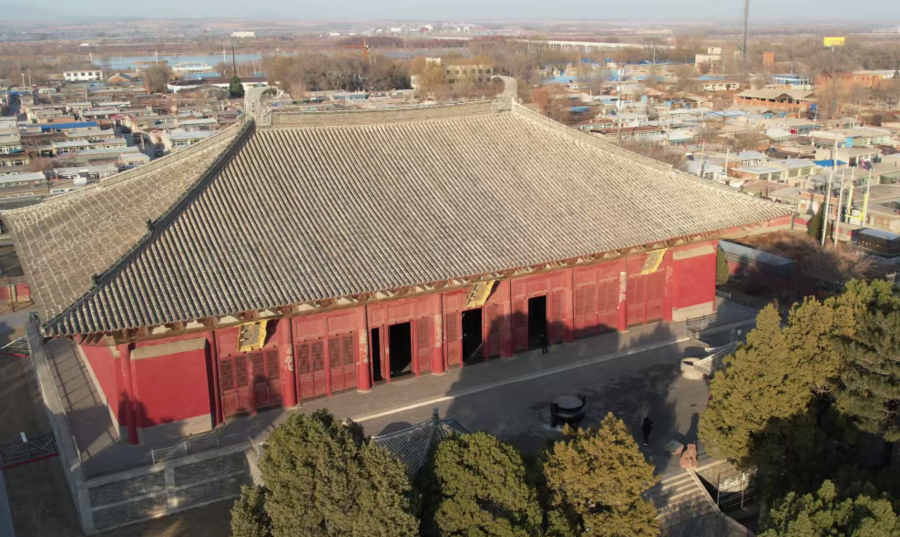 沿奉国寺中轴线走过,古建筑错落排开,其中以主体建筑辽代遗构大雄殿最为知名。其通高20余米,高踞于3米台基之上。