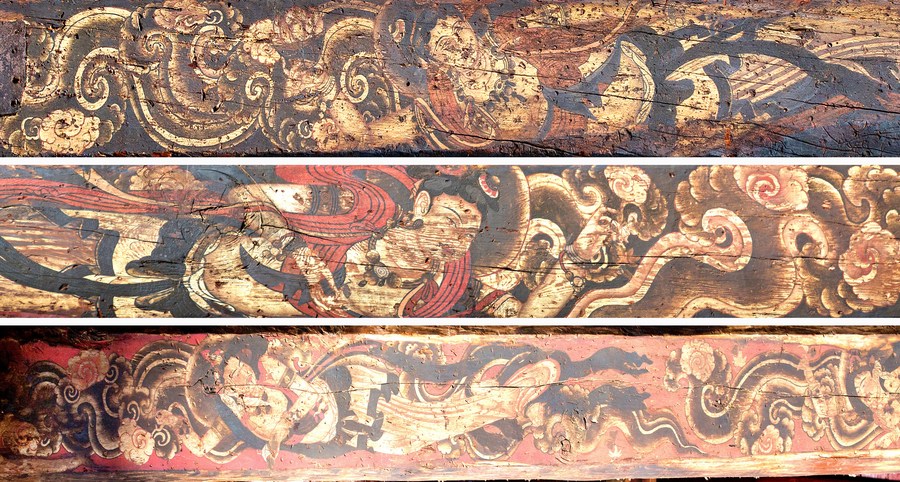 “辽代工匠会在梁枋上涂上涂料,用来防蛀、防潮,后来发展成各式各样的彩画。”于凤雷说,“大雄殿梁架上遗存2400多平方米彩画,其中42幅飞天为男相,颇有唐代遗韵,精美程度能与敦煌媲美。”