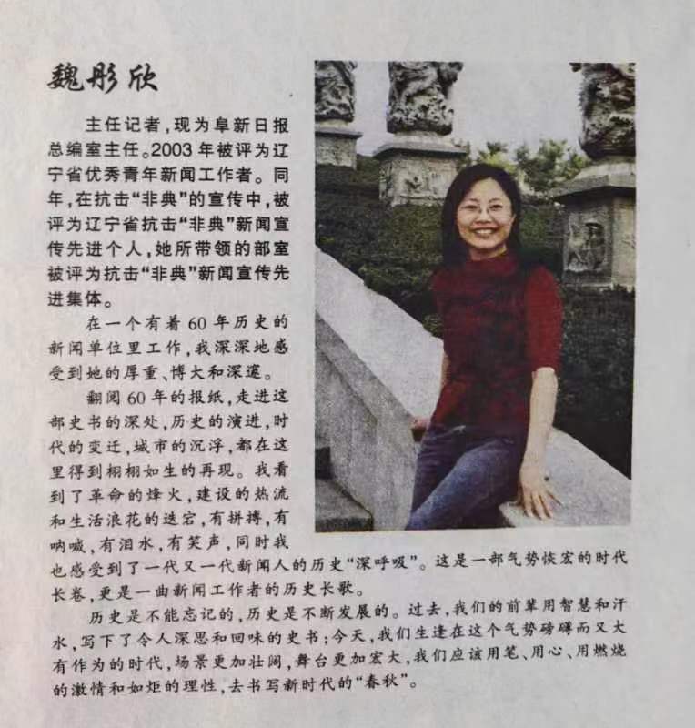 魏彤欣1993年进入阜新日报社做记者,她给自己定的努力方向就是:到一线去,到平凡的生活中去,歌颂美好情操,弘扬时代精神。她撰写的20余篇新闻作品荣获省级以上新闻奖项,她本人荣获阜新市十大女杰、辽宁省十佳新闻工作者等多项荣誉。