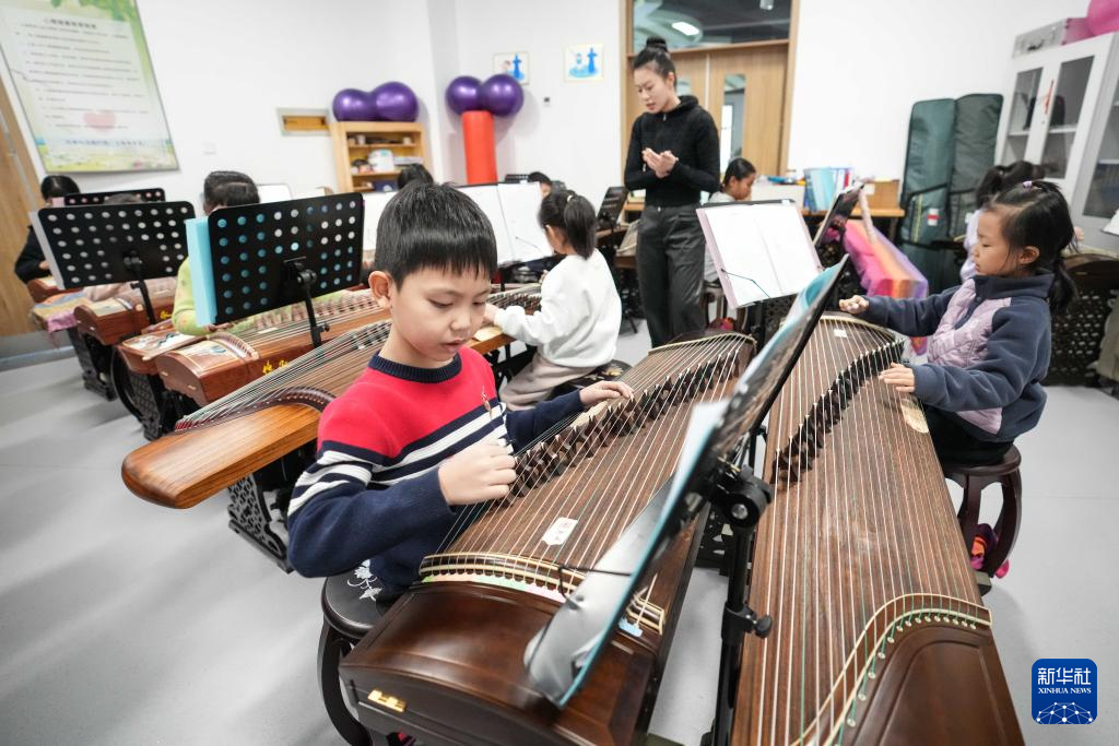 1月24日,参加托管班的学生在学习古筝弹奏。新华社记者 潘昱龙 摄pagebreakpagebreak