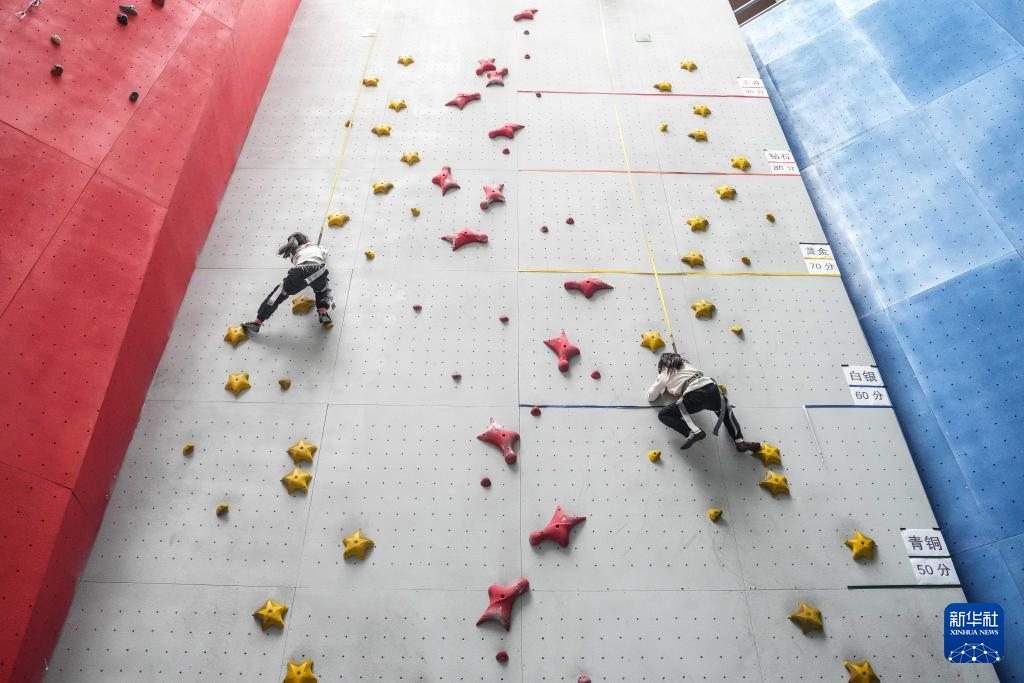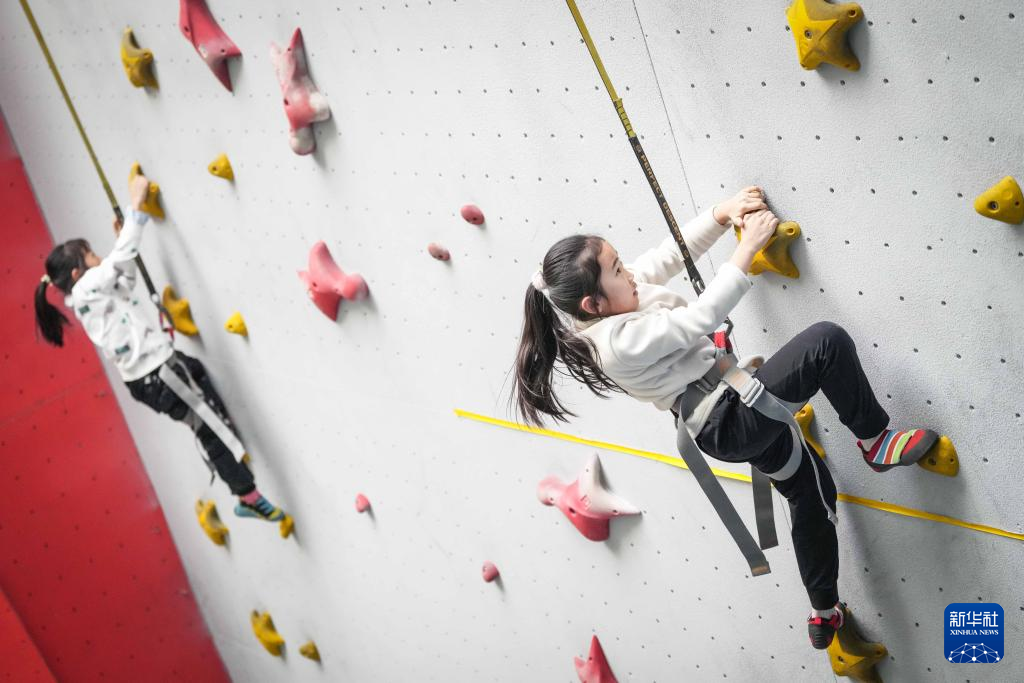 1月25日,参加托管班的学生在练习攀岩。新华社记者 潘昱龙 摄