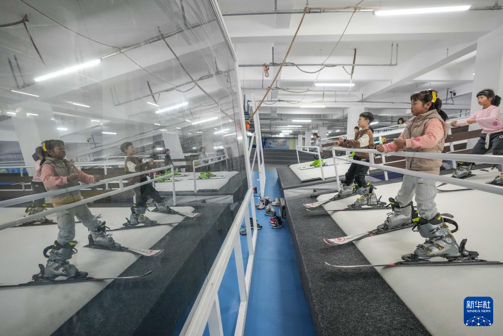 1月24日,参加托管班的孩子在滑雪机上学习滑雪。新华社记者 潘昱龙 摄pagebreakpagebreak