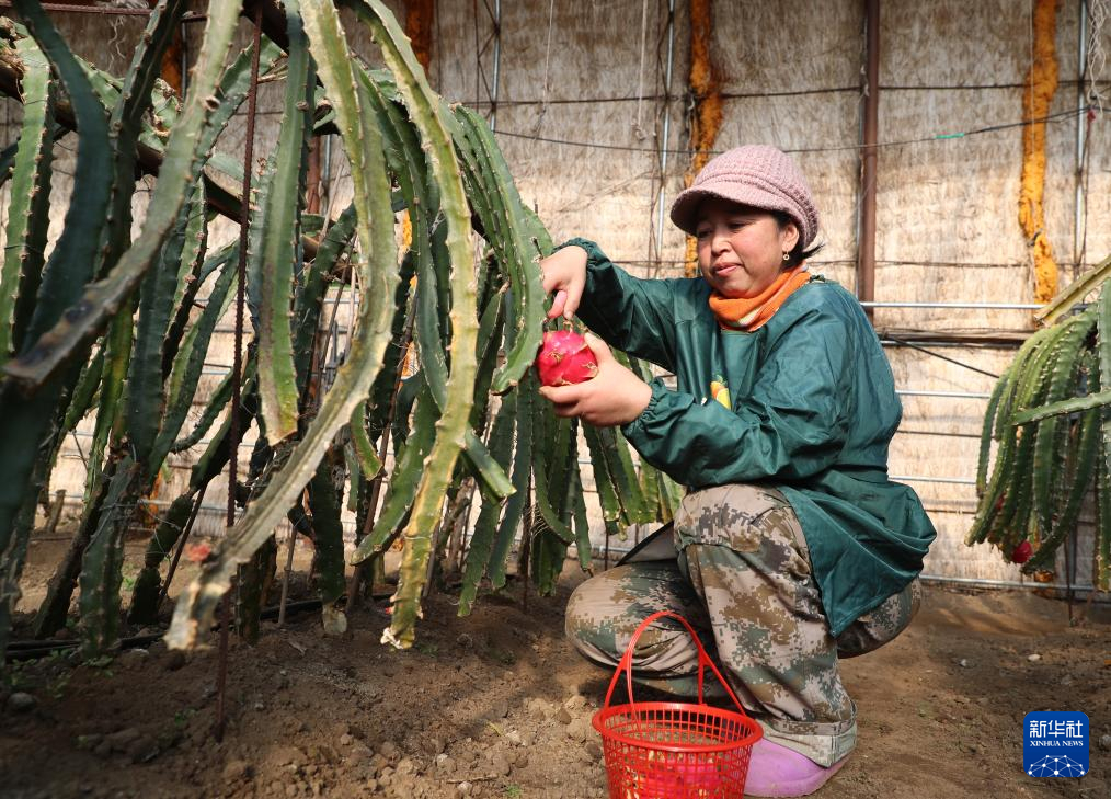 在辽宁省辽阳市辽阳县下达河乡大牛岭村,农民在大棚内收获火龙果。新华社记者杨青 摄