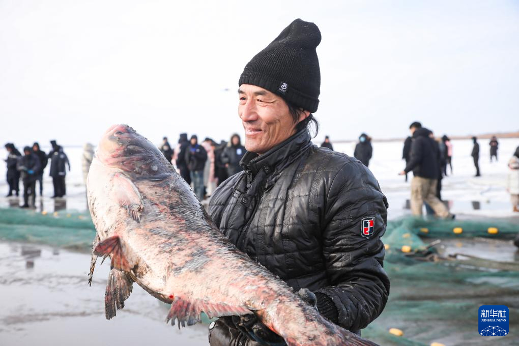 2月1日,工作人员在沈阳市康平县卧龙湖冬捕作业现场展示刚捕获的鱼。新华社发pagebreak