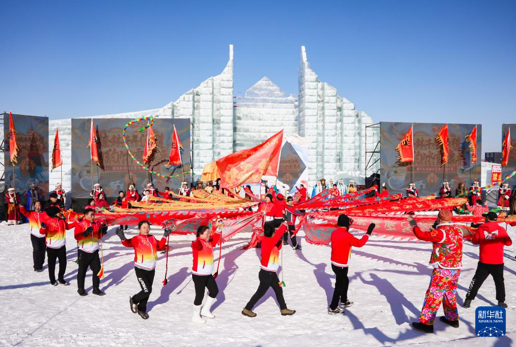 2月1日,人们在沈阳卧龙湖大辽文化冬捕节现场进行表演。新华社发