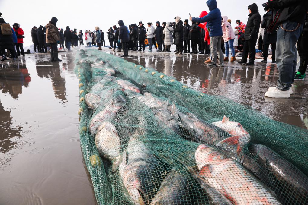 新华网沈阳2月2日电(记者于也童)一望无际的卧龙湖冰面上,伴随着“鱼把头”的阵阵号子声,一大网活蹦乱跳的大鱼从冰水里被捞出,跃动翻腾……2024年第九届沈阳卧龙湖大辽文化冬捕节上,“冰湖腾鱼”的精彩一幕,让前来参观的游客流连忘返。