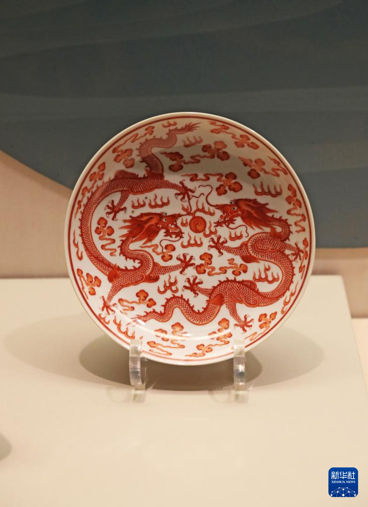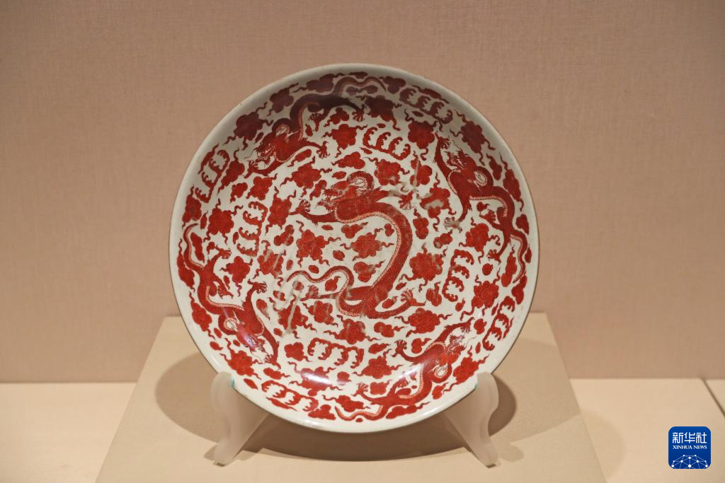 2月2日在辽宁省博物馆拍摄的矾红彩双龙戏珠纹盘。新华社记者 杨青 摄pagebreak