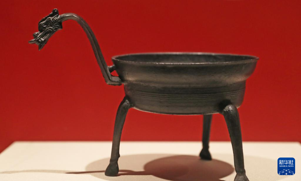 2月2日在辽宁省博物馆拍摄的龙首铜鐎斗。新华社记者 杨青 摄