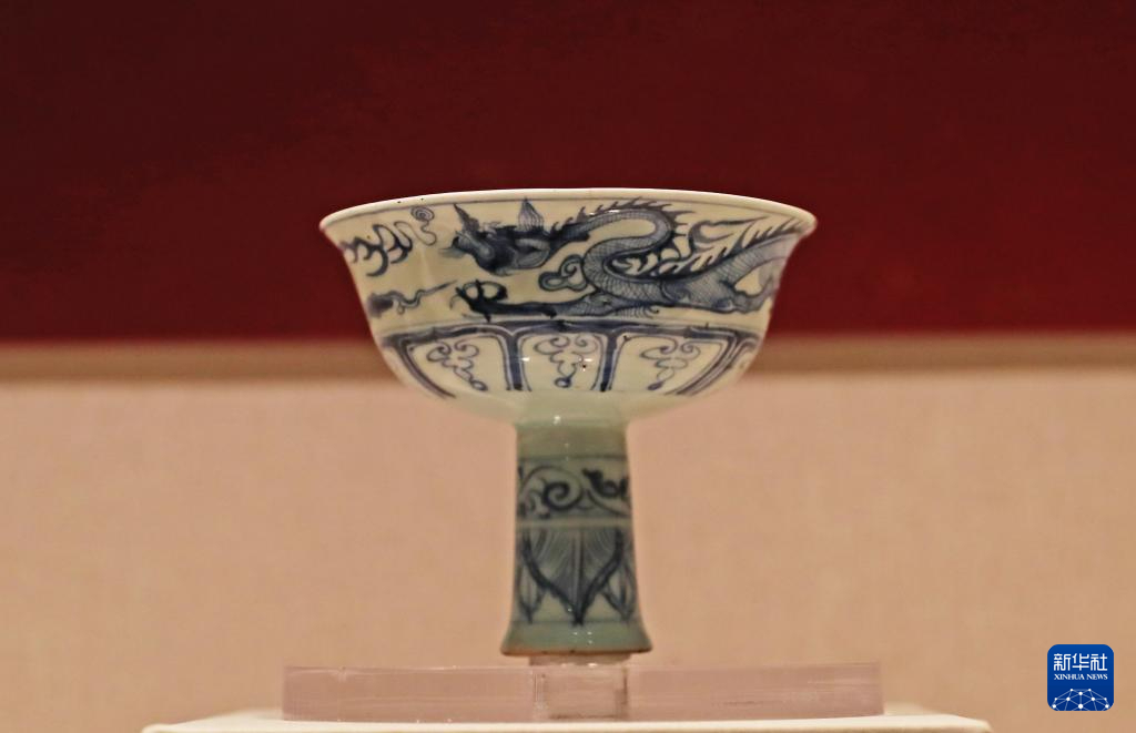 2月2日在辽宁省博物馆拍摄的青花云龙纹高足杯。新华社记者 杨青 摄pagebreak