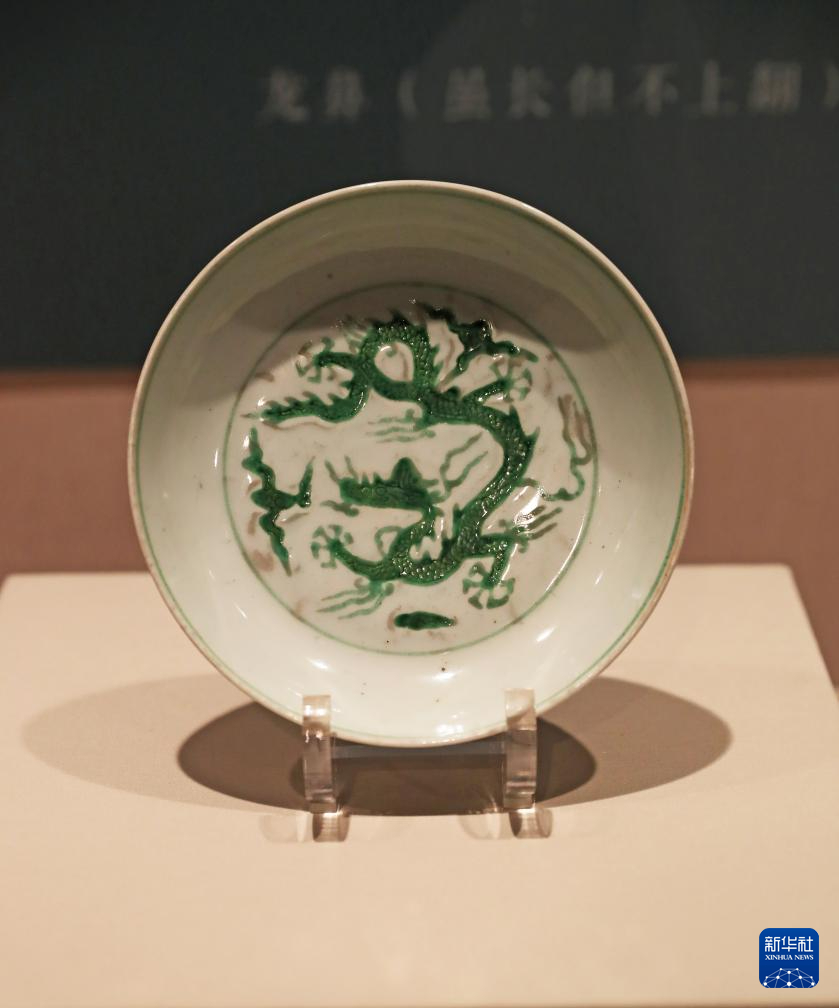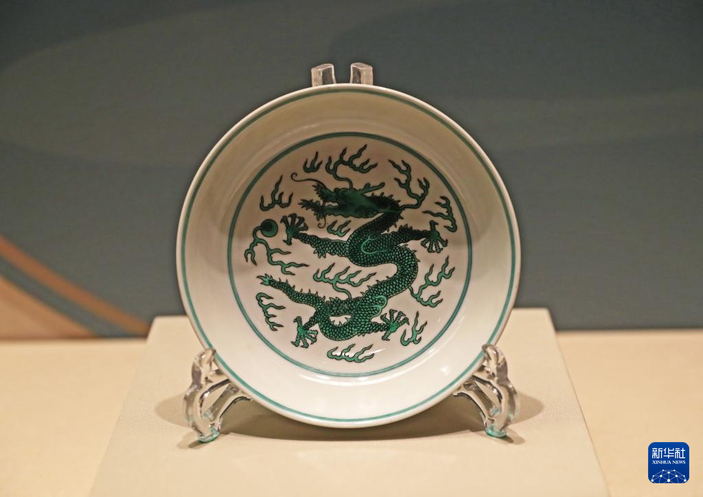 2月2日在辽宁省博物馆拍摄的雕填绿彩龙纹盘。新华社记者 杨青 摄pagebreak