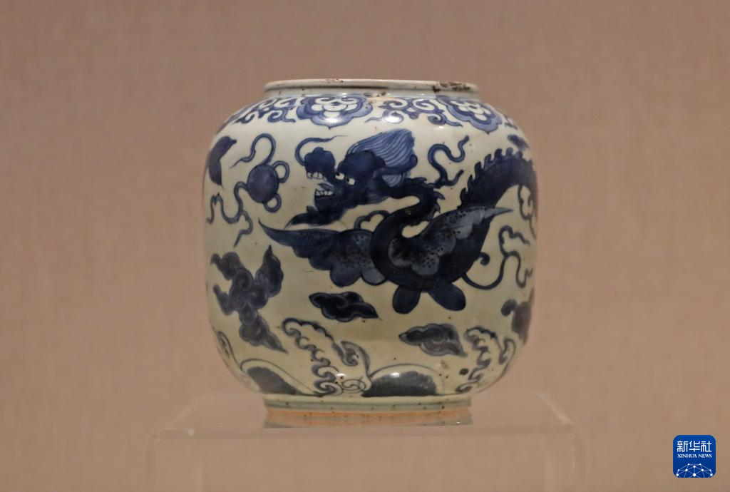 2月2日在辽宁省博物馆拍摄的青花飞龙纹罐。新华社记者 杨青 摄pagebreak