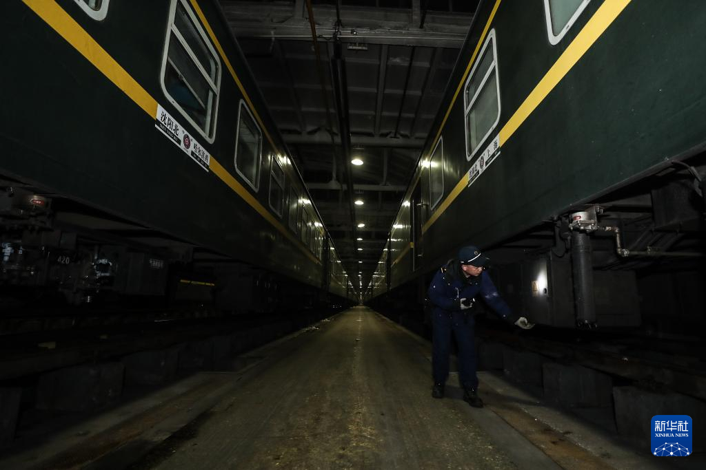 春运期间,除了严寒,最大的挑战是比平时更繁重的检修任务。田鹤所在班组每晚要对5趟列车进行检修作业,从20点到第二天5点,在9个小时内要检修近百辆客车。这些列车有的要经受严寒考验抵达黑龙江漠河,有的要跨越半个中国前往青海西宁。像田鹤这样的检修人员,沈阳车辆段有近1500名,他们在寒夜中检修列车,保障乘客春运期间安全、温暖出行。pagebreak