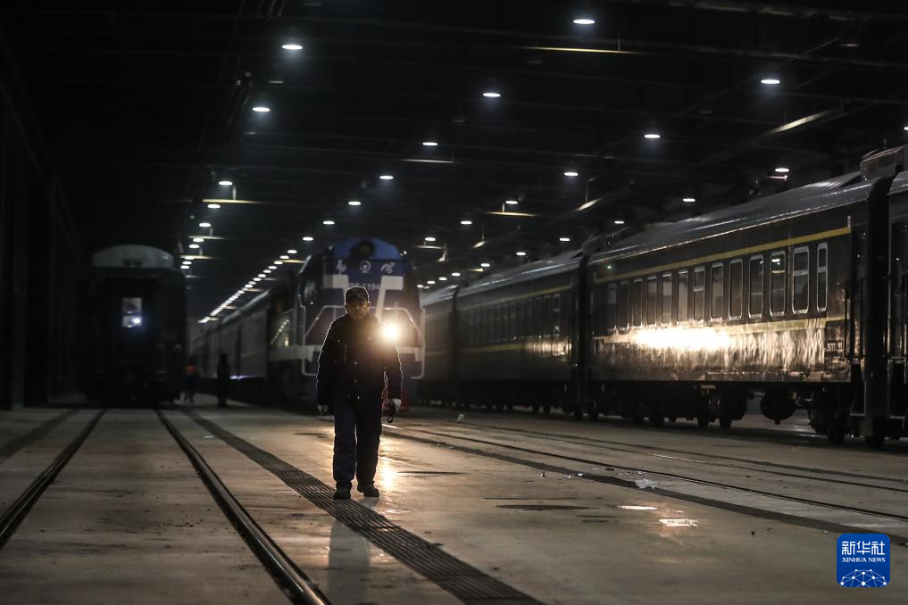 2月5日,田鹤在一列普速列车内进行检修工作。新华社记者 潘昱龙 摄pagebreak