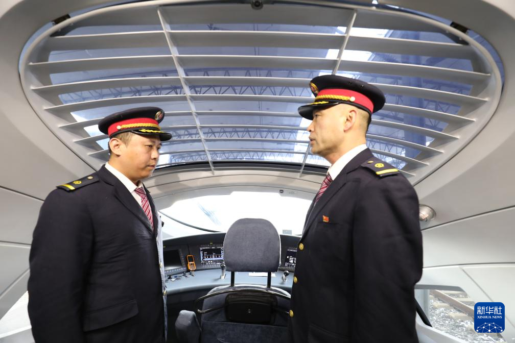 2月4日,在沈阳北站,交班司机和接班司机在司机室交接动车组运行状态和行车备品。新华社记者 杨青 摄