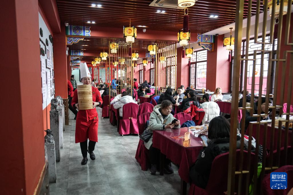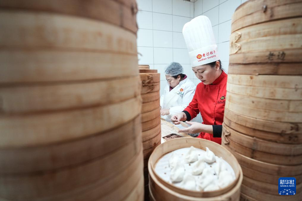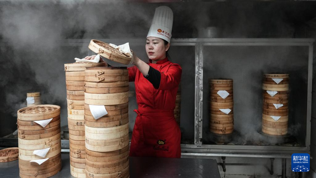 “今年过年沈阳文旅火爆,我们老边饺子馆春节不打烊,迎接全国各地的食客。”郑春香说。从年三十到初五来品尝老边饺子的食客络绎不绝,初五这天更是达到顶峰。郑春香与同事们在厨房堆成小山般的蒸笼旁忙碌不停,一擀,一填,一捏,一个饺子便落入笼中。经过几分钟的蒸制,热气腾腾的饺子被端上餐桌。