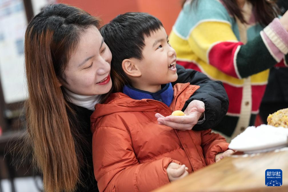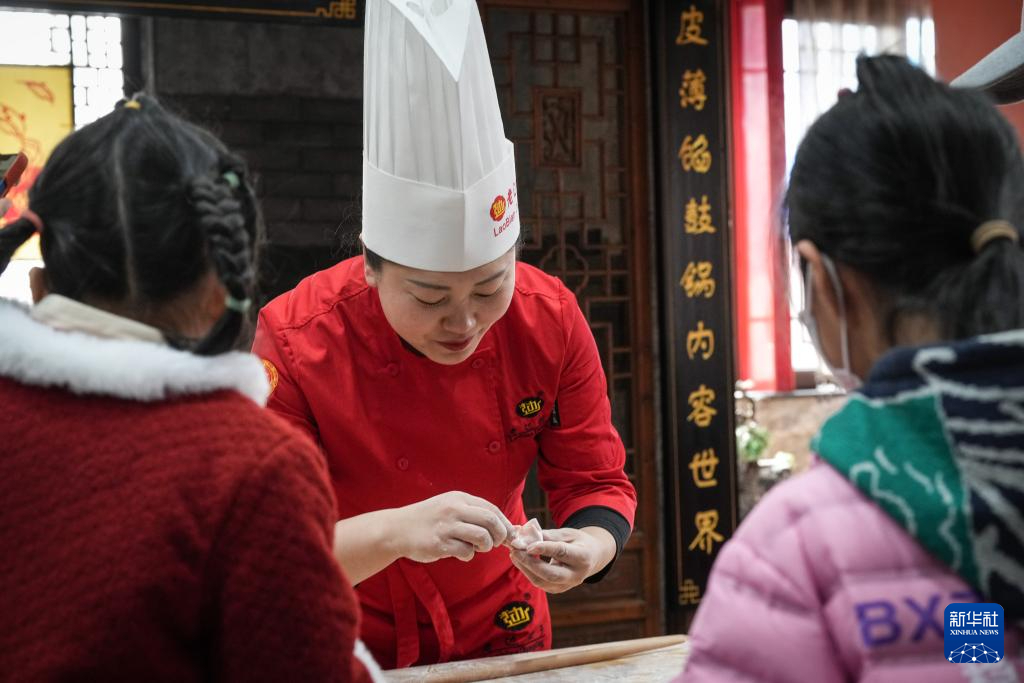 2月14日,郑春香为小朋友展示包饺子。新华社记者 潘昱龙 摄pagebreak