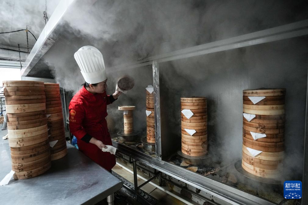 2月14日,郑春香在查看饺子的蒸制情况。新华社记者 潘昱龙 摄pagebreak