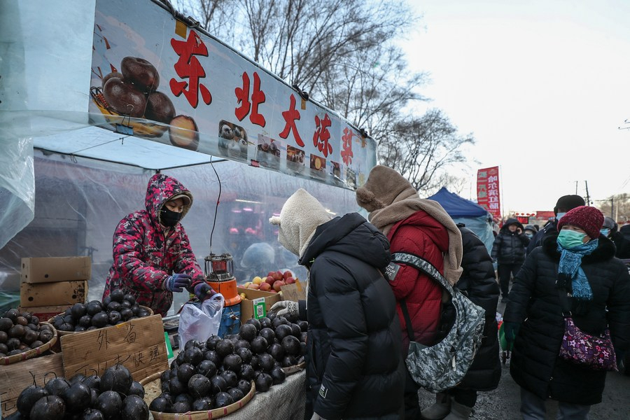 游客在沈阳小河沿早市购买冻梨。新华社记者 潘昱龙 摄