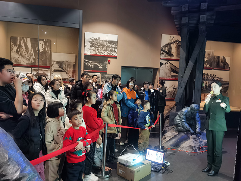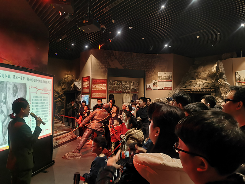 新春佳节,万家灯火,和谐安宁,但在七十多年前战火纷飞的朝鲜战场,志愿军战士又是怎样度过春节的呢?在展厅“无敌坑道”场景前,纪念馆特别策划了“志愿军在朝鲜的三个春节”宣讲微课堂,讲解员结合场景和投影屏,为观众现场介绍志愿军战士们用手中的枪炮代替鞭炮,向敌军阵地英勇冲锋,在战斗中用热血、用胜利迎接新春的到来。伴随着讲解员的深情讲述,观众们饱含敬意,驻足聆听。