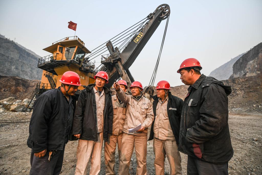 郭明义(右三)在鞍钢矿业集团齐大山铁矿采场与工友交流制订修路方案。 新华社记者 潘昱龙 摄