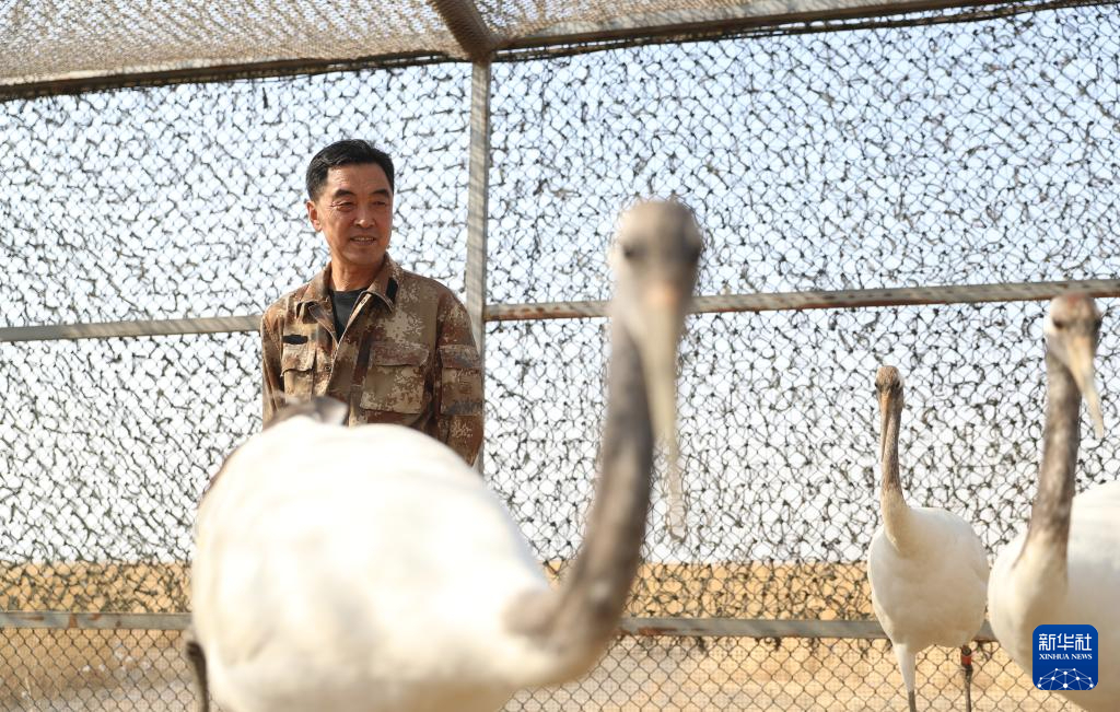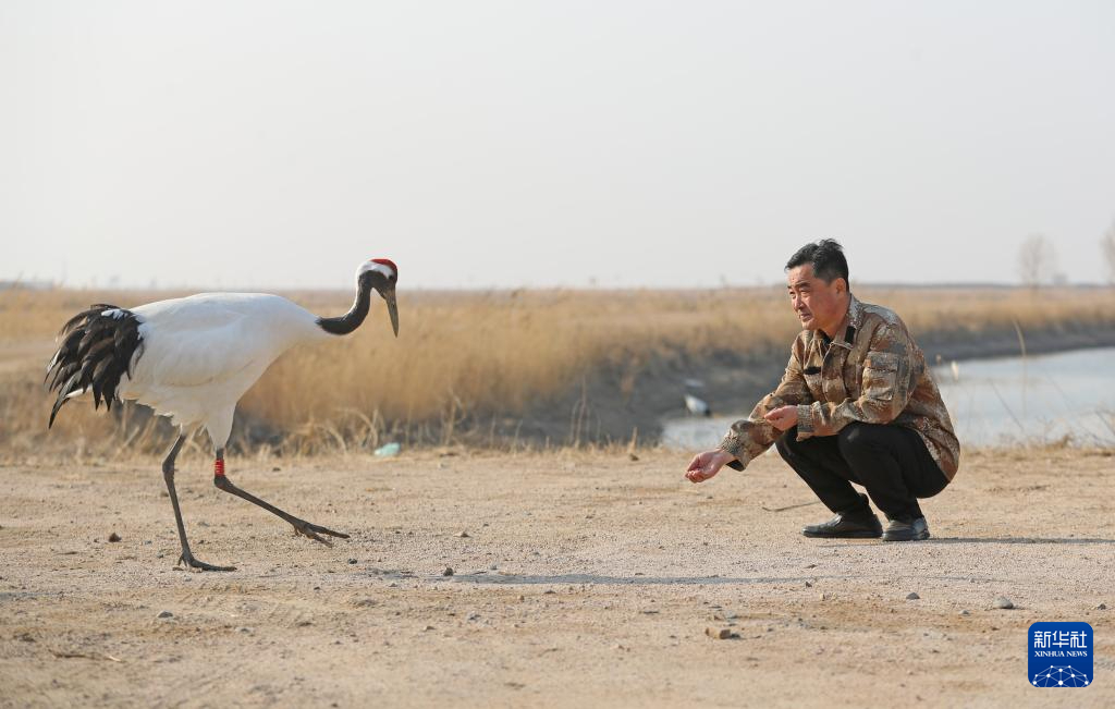 3月18日,在辽河口国家级自然保护区鹤类繁育保护站,赵仕伟查看丹顶鹤生长情况。新华社记者 杨青 摄pagebreak