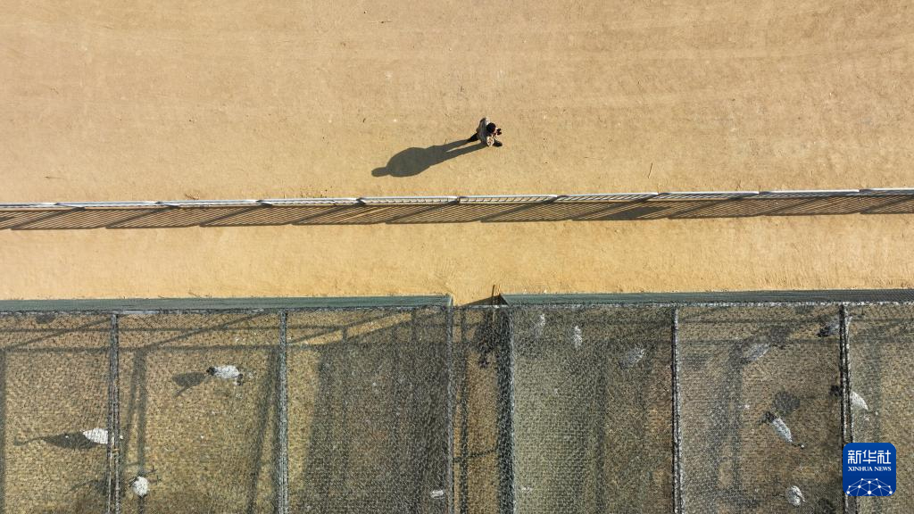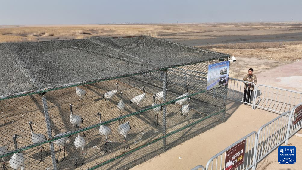 3月18日,赵仕伟在辽河口保护区幼鹤暂养场查看幼年丹顶鹤(无人机照片)。新华社记者 杨青 摄pagebreak