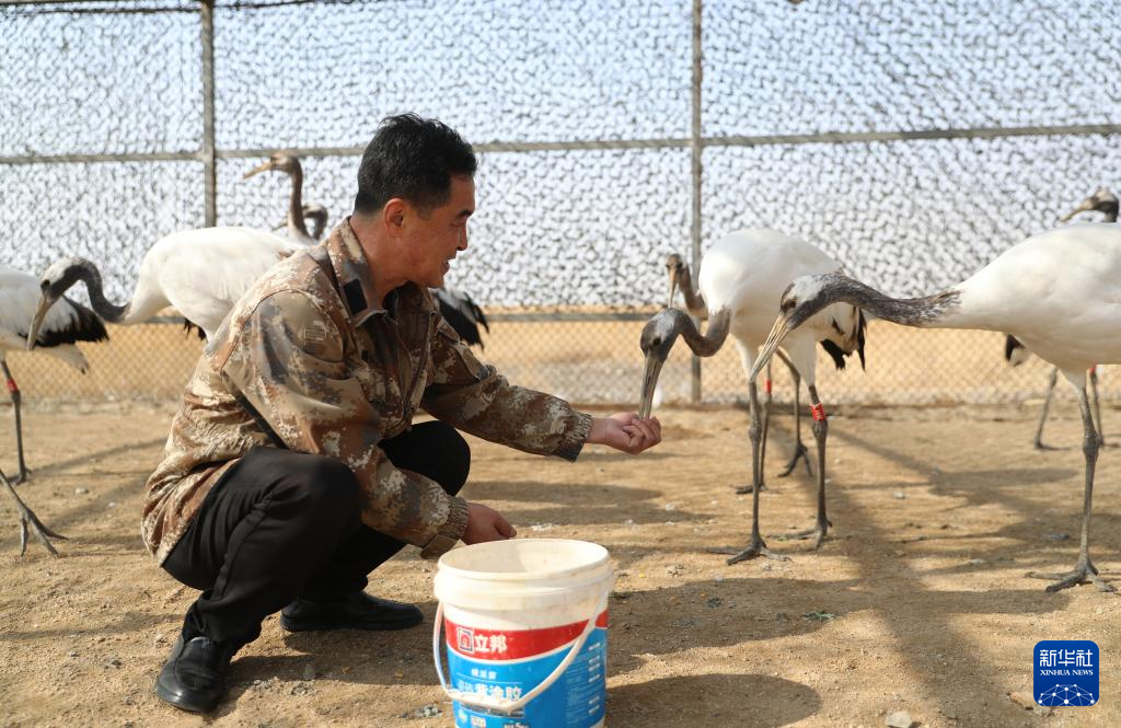 3月18日,在辽河口国家级自然保护区鹤类繁育保护站,赵仕伟给丹顶鹤喂食。新华社记者 杨青 摄pagebreak