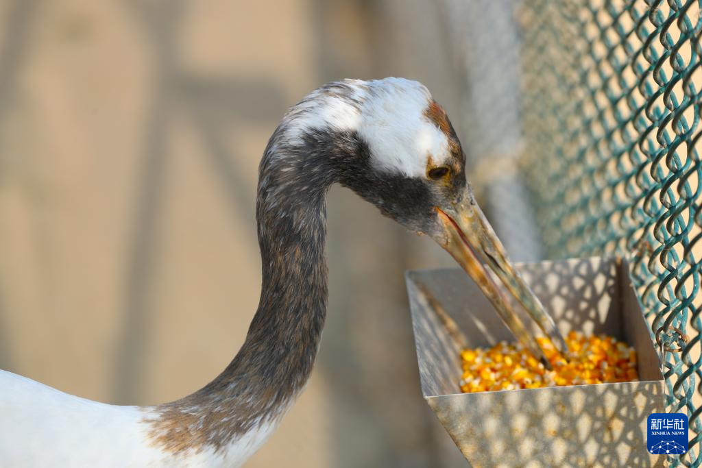 3月18日,在辽河口保护区幼鹤暂养场,丹顶鹤在吃玉米。新华社记者 杨青 摄