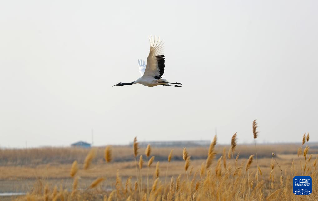 3月18日,在辽河口国家级自然保护区鹤类繁育保护站,一只野生丹顶鹤在空中飞翔。新华社记者 杨青 摄pagebreak