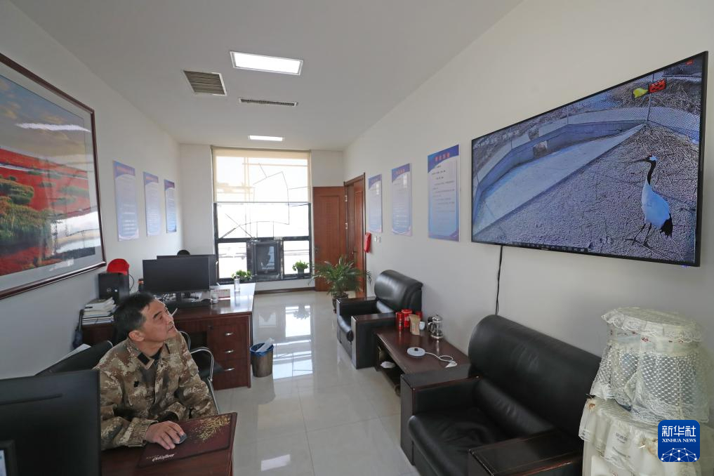 3月18日,在辽河口国家级自然保护区鹤类繁育保护站,赵仕伟调用监控查看丹顶鹤饲养情况。新华社记者 杨青 摄pagebreak
