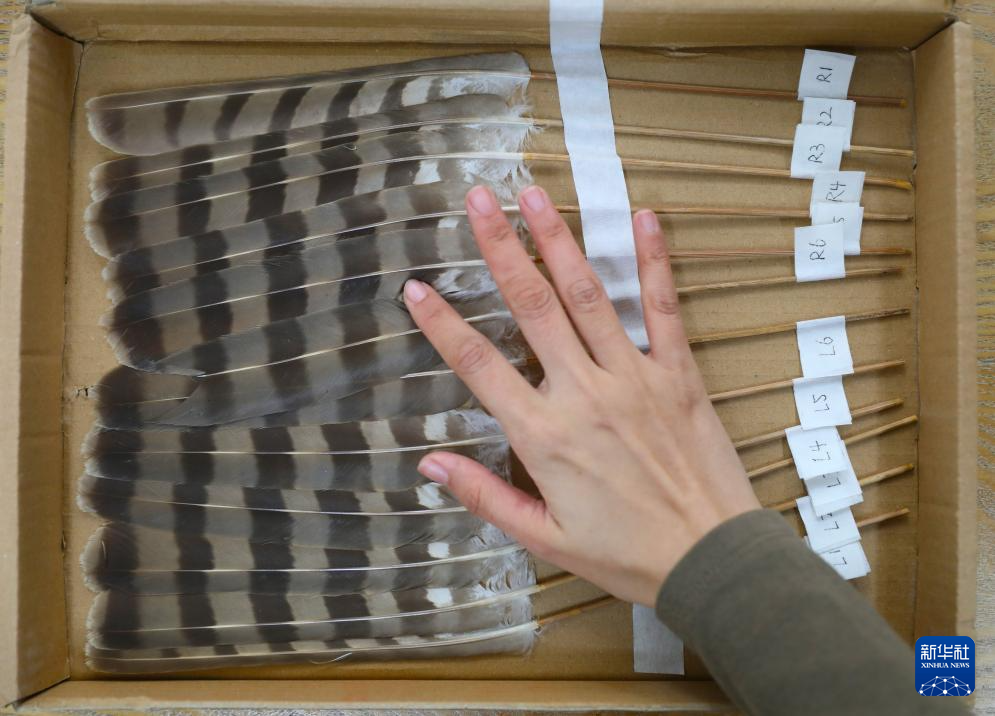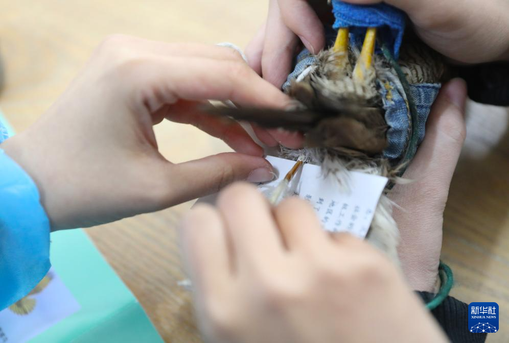 3月23日,在沈阳猛禽救助中心,孟蝶给受伤的雀鹰接羽。新华社记者 杨青 摄pagebreak