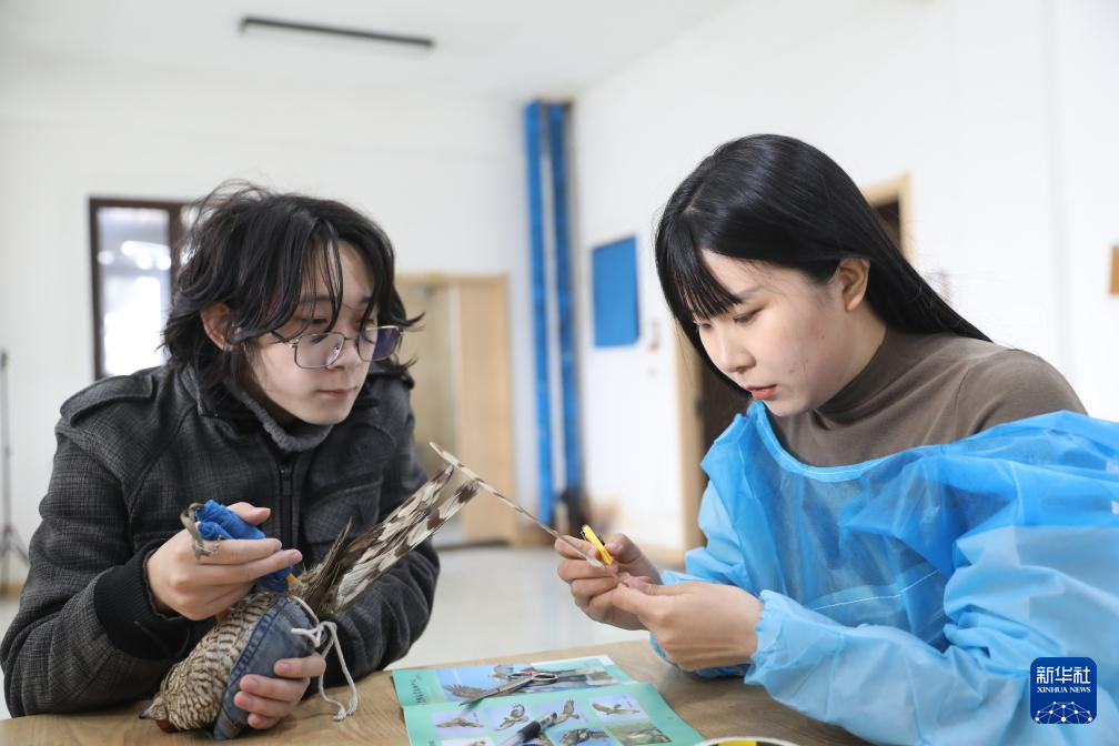 3月23日,在沈阳猛禽救助中心,孟蝶(右)给受伤的雀鹰接羽。新华社记者 杨青 摄