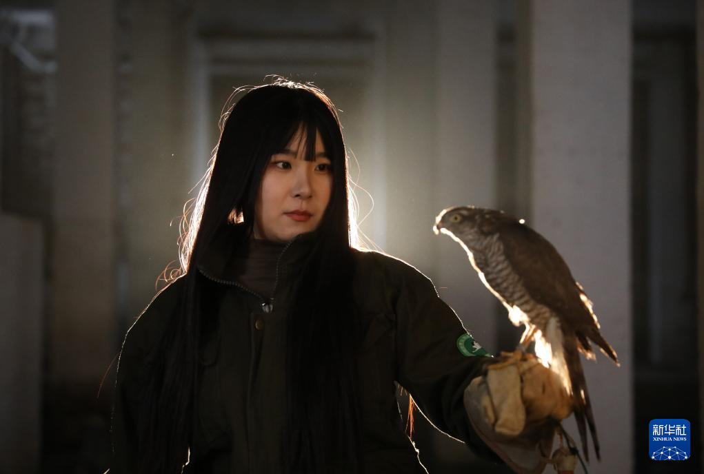 3月23日,在沈阳猛禽救助中心,孟蝶给受伤的雀鹰带上鹰帽。新华社记者 杨青 摄pagebreak