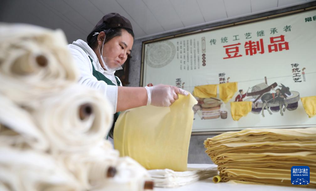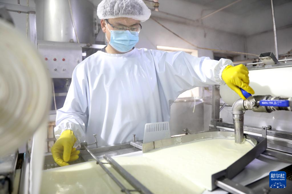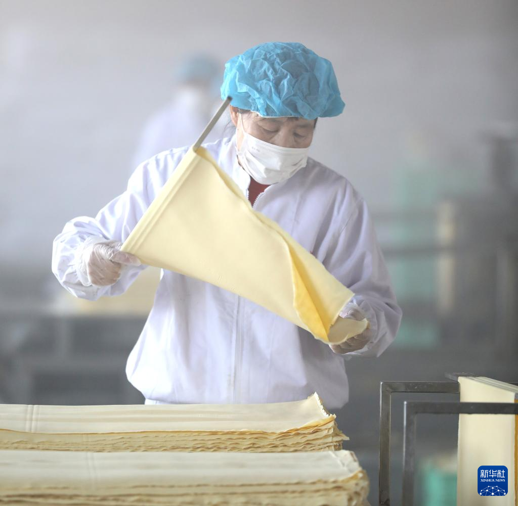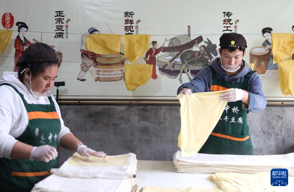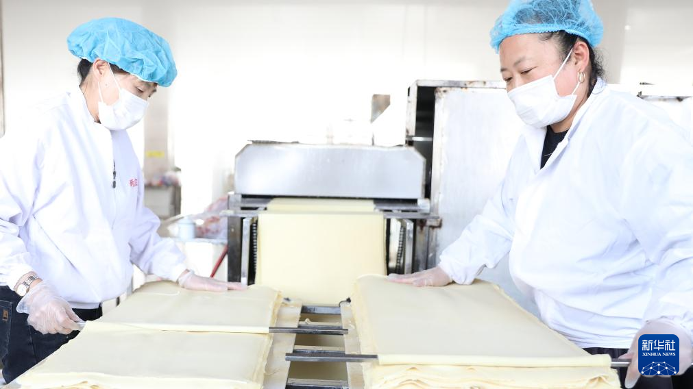 3月21日,工人在亮中桥镇的昌图福源食品有限公司车间内将做好的干豆腐铺开。新华社记者 姚剑锋 摄