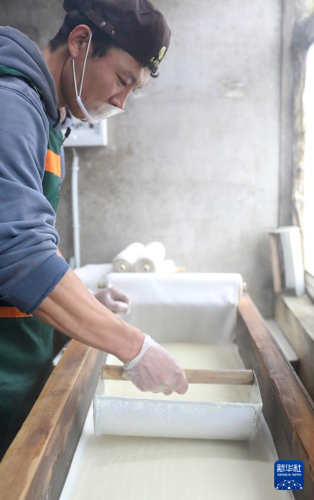 3月22日,吕计磨坊创始人吕宏宇在自家的磨坊内制作手工干豆腐。新华社记者 姚剑锋 摄