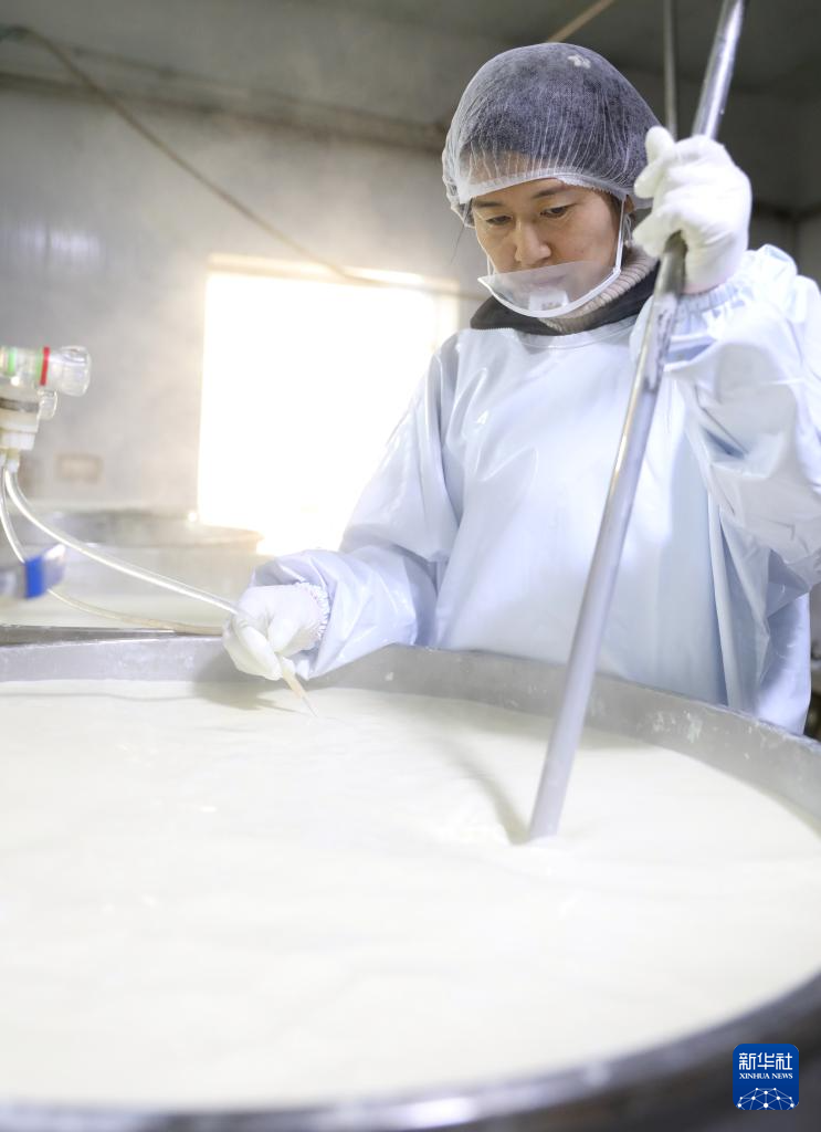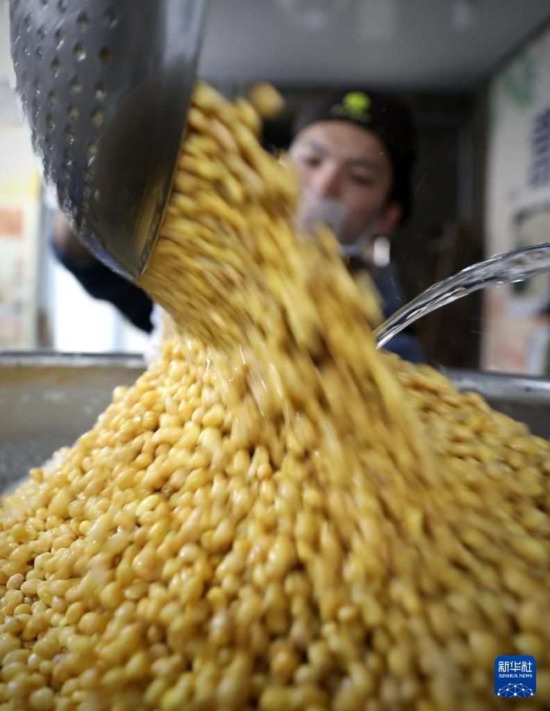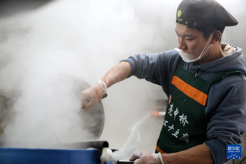 3月21日,工人在亮中桥镇的昌图红瑞食品酿造有限公司车间豆浆锅内一边点卤水,一边进行搅拌。新华社记者 姚剑锋 摄