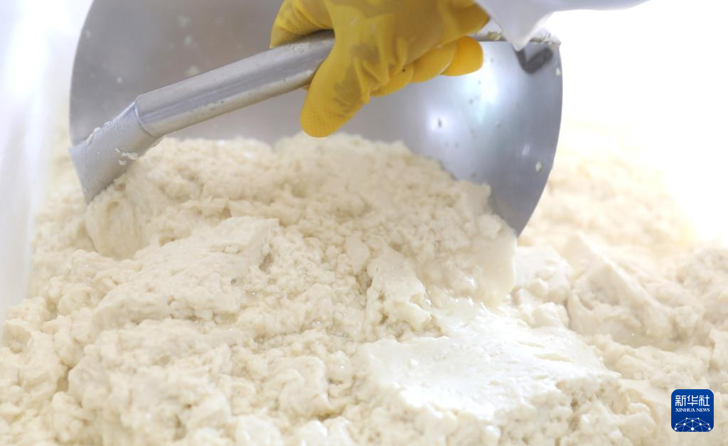 3月21日,工人在亮中桥镇的昌图红瑞食品酿造有限公司车间内捞起制作干豆腐用的豆腐脑。新华社记者 姚剑锋 摄